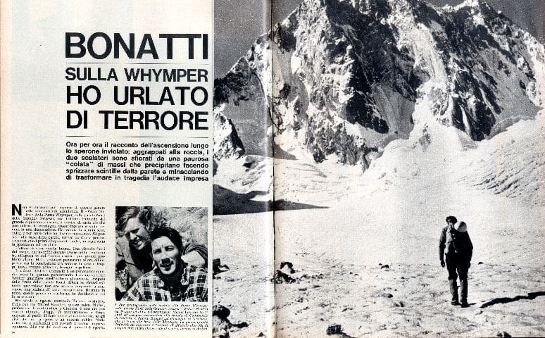 «Epoca» del 23 agosto 1964: il viso scavato e fiero di Walter Bonatti, trentatré anni, occupa la copertina sotto il titolo Bonatti racconta – Quattro giorni con la morte. È la cronaca drammatica, ora per ora, dell’ascensione con la quale, dal 6 al 10 agosto 1964, Walter Bonatti apre una nuova via sul gran Diedro della Punta Whymper, parete Nord delle Grandes Jorasses, Massiccio del Monte Bianco. Con lui Michel Vaucher, professore di matematica ventisettenne alla Scuola di Commercio di Ginevra. Bonatti non lo conosce, ma i due si intendono subito. La nervatura della Punta Whymper solca tutta la parte alta, rocciosa, della gran gola centrale, con andamento pressoché simmetrico ai due speroni della Punta Walker, già conquistata da Bonatti e altri nell’agosto del 1949, e della Punta Croz. I due si trovano coinvolti in una situazione assai critica, ma facendo forza sulle loro eccezionali capacità e su un morale non comune, riescono a uscirne anche questa volta pressoché indenni. Inizia così, quasi una conclusione, il reportage di Walter: «Non vi saranno più imprese di questo genere nella mia carriera alpinistica». Il primo giorno sono sfiorati da una caduta di pietre, che taglia le loro due corde, ma si innalzano per circa 600 m. Durante il primo bivacco la parete trema: una torre rocciosa si è staccata per il disgelo. A causa della frana le pietre continuano a cadere e la cordata può elevarsi di poco nel corso del secondo giorno. Durante il secondo bivacco nevica, al mattino la parete è coperta di neve e ghiaccio. La cordata si innalza tuttavia per circa 300 m nel corso della terza giornata. Il terzo bivacco è molto duro per il freddo polare (-20°). Alle 18.30 del quarto giorno raggiungono finalmente la vetta. Quarto bivacco nella discesa e ancora neve. La narrazione si chiude con una riflessione serena e amara al tempo stesso: «Quindici anni fa, proprio in agosto, proprio in questi giorni, aprivo la serie delle mie scalate, percorrendo lo sperone Nord della punta Walker su queste stesse Grandes Jorasses. Ora chiudo la serie ancora qui, sulla vicina Punta Whymper, i cui profili cominciarono ad ossessionarmi quindici anni fa. È forse il destino che mi ha portato qui e il destino ha una sua logica. La parete che ho vinto era l’ultimo baluardo di un grande alpinismo internazionale che ora purtroppo non esiste più».