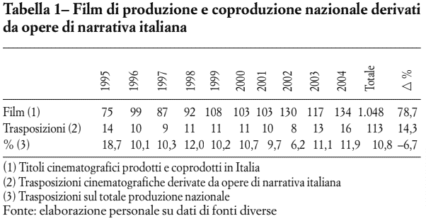 Il trend dei titoli con soggetto derivato da opere di narrativa italiana non ha seguito lo stesso corso e appare indipendente dall’andamento dell’annuale produzione cinematografica complessiva. Il numero delle trasposizioni è calato da 14 a 10 tra il 1995 e il 1996; è sceso a 9 nel 1997; si è mantenuto costante, all titoli, tra il 1998 e il 2000; è calato di una unità nel 2001 e di altre due nel 2002; infine, ha ripreso a salire, a 13 titoli nel 2003 e a 16 nel 2004. Altalenante è anche la quota percentuale delle traduzioni filmiche sul totale dell’offerta, che mostra un andamento decrescente tra il 1995 e il 2002 (dal 18,7% al 6,2%), crescente nel 2003 (11,1%) e nel 2004 (11,9%) (Tabella 1).