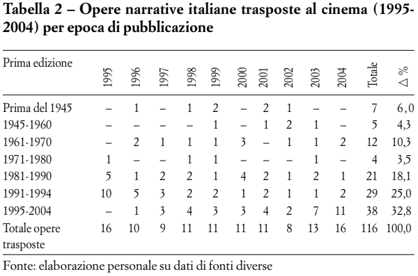 In dieci anni sono stati distribuiti nelle sale 113 film derivati da 116 romanzi e racconti di autore italiano. Ciò significa che, mediamente, ogni anno il 10,8% della produzione cinematografica interna è costituito da trasposizioni di opere narrative nazionali.