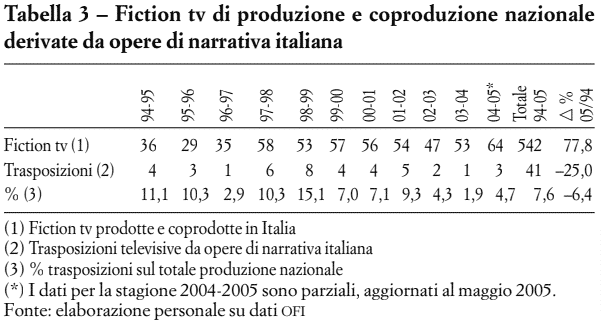 Se l’andamento delle traduzioni filmiche è altalenante, non lo è meno quello dell’offerta televisiva. Secondo i dati dell’Osservatorio sulla Fiction Italiana (OFi), l’incremento di titoli e ore di fiction tv trasmessi non è stato accompagnato da un proporzionale aumento delle trasposizioni. La quota dei prodotti televisivi con soggetto derivato da romanzi e racconti italiani, rispetto alla produzione complessiva, è scesa dall’11,1% della stagione 1994-1995 all’ 1,9% della stagione 2003-2004. Il risultato parziale per il 2004-2005, aggiornato a maggio 2005, mostra una leggera ripresa, attestandosi al 4,7%. Complessivamente, nelle 11 stagioni comprese fra il 1994 e il 2005,41 titoli su 542 (pari al 7,6%) sono stati tratti da libri di autore italiano (Tabella 3).