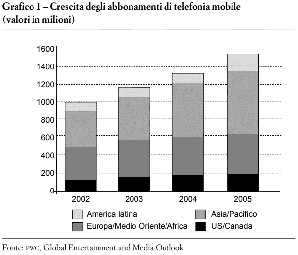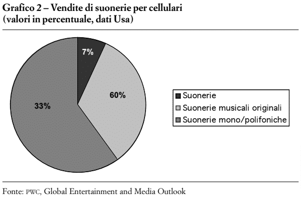 L’altro canale emergente per il settore musicale è quello della telefonia (Grafico 1), dove un particolare e importante spazio occupa il segmento delle suonerie (Grafico 2). La compagnia telefonica 3 può contare su 70 milioni di abbonati al servizio in tutto il mondo e Vodafone, solo in Europa, su 5 milioni. Le principali case discografiche come Warner, Universal e BMG hanno riversato i loro cataloghi in suonerie e gli artisti più famosi, come Robbie Williams e Shakira, producono appositi brani musicali o videoclip per questo segmento di mercato, composto per lo più da giovani tra i 18 e i 35 anni.