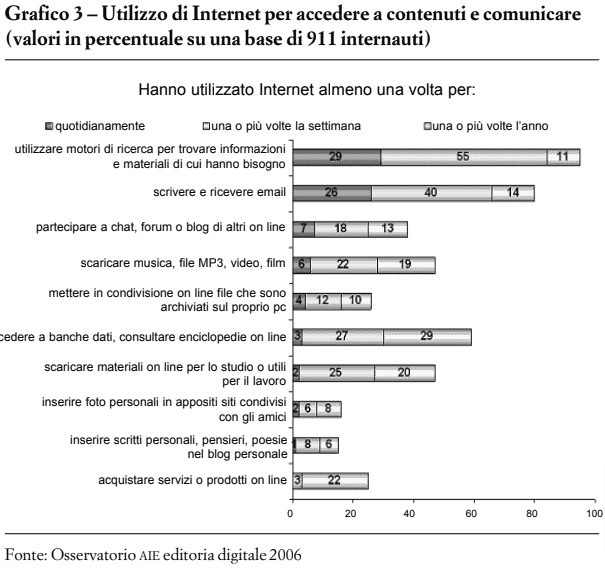 Questi dati sono confermati anche dall’Osservatorio Aie sull’editoria digitale: prima si utilizzano i motori di ricerca, solo successivamente, se i risultati non sono soddisfacenti, si passa ad altre fonti più specialistiche (Grafico 3).
